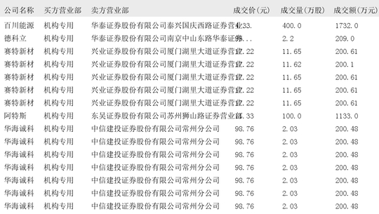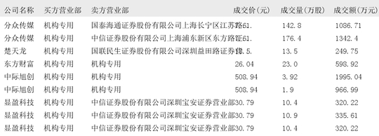 今日大宗交易榜单中出现机构买入席位的个股为:分众传媒、楚天龙、东方财富、中际旭创、显盈科技、百川能源、德科立、赛特新材、阿特斯、华海诚科。