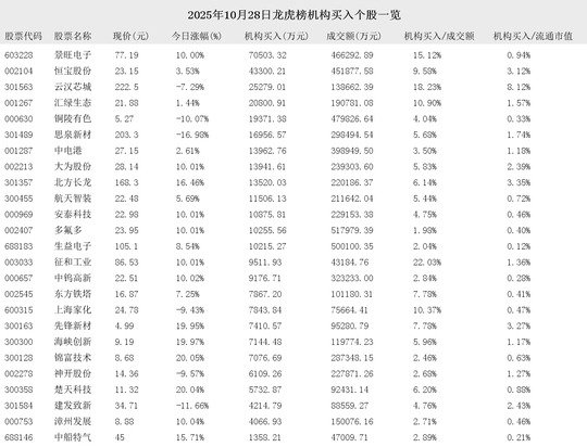 2025年10月28日盘后龙虎榜公开信息中,有52支股票出现了机构的身影。其中,有25支股票出现了机构买入,27支股票出现了机构卖出。