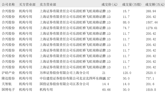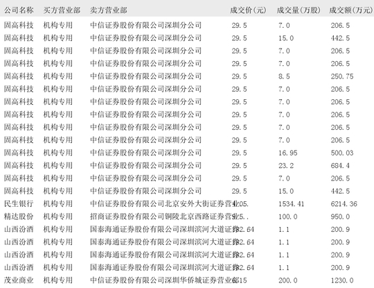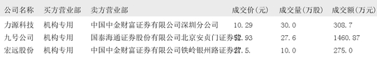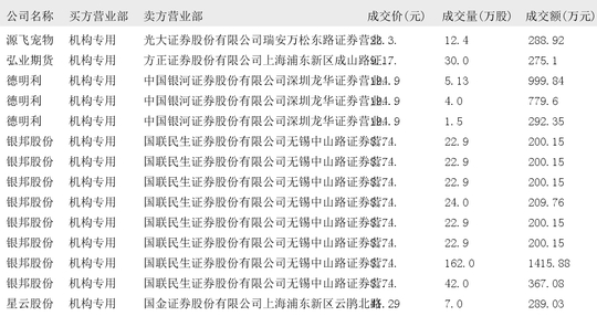 今日大宗交易榜单中出现机构买入席位的个股为:源飞宠物、弘业期货、德明利、银邦股份、星云股份、盛弘股份、易瑞生物、江南奕帆、凯格精机、盟固利、固高科技、民生银行、精达股份、山西汾酒、茂业商业、恒立液压、百傲化学、再升科技、天创时尚、威奥股份、合兴股份、沪硅产业、隆达股份、天智航、国博电子、力源科技、九号公司、宏远股份。