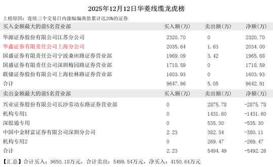 买入前5席为:华源证券股份有限公司江苏分公司、华鑫证券有限责任公司上海分公司、国盛证券有限责任公司宁波桑田路证券营业部、国盛证券有限责任公司深圳梅园路证券营业部、联储证券股份有限公司上海松林路证券营业部。共计买入:9647.96万元,共计卖出:5.05万元。