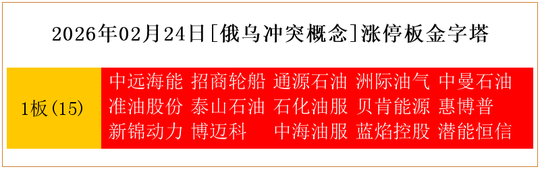 一共有15支个股涨停。其中,中远海能、招商轮船、通源石油、洲际油气、中曼石油、准油股份、泰山石油、石化油服、贝肯能源、惠博普、新锦动力、博迈科、中海油服、蓝焰控股、潜能恒信1板。
