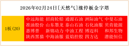 一共有20支个股涨停。其中,中远海能、招商轮船、通源石油、洲际油气、中曼石油、准油股份、山东墨龙、泰山石油、石化油服、贝肯能源、惠博普、新锦动力、中油工程、博迈科、和邦生物、陕西黑猫、中海油服、蓝焰控股、四方达、潜能恒信1板。