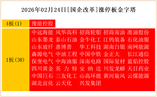 一共有39支个股涨停。其中,豫能控股4板;中远海能、风华高科、招商轮船、招商南油、准油股份、山东墨龙、泰山石油、金牛化工、江钨装备、石化油服、山东玻纤、惠博普、华工科技、湖南白银、南网能源、森源电气、中油工程、中国中铁、金正大、长江通信、保变电气、中海油服、深南电路、国际复材、蓝焰控股、四川黄金、英 力 特、安 纳 达、川发龙蟒、天目药业、中国巨石、三友化工、山高环能、黄河旋风、云煤能源、湖北宜化、云天化、兴发集团1板。