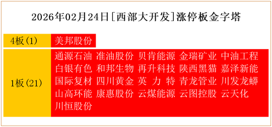 一共有22支个股涨停。其中,美邦股份4板;通源石油、准油股份、贝肯能源、金瑞矿业、中油工程、白银有色、和邦生物、再升科技、陕西黑猫、嘉泽新能、国际复材、四川黄金、英 力 特、青龙管业、川发龙蟒、山高环能、康惠股份、云煤能源、云图控股、云天化、川恒股份1板。