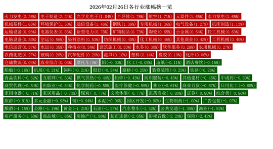 今日涨幅居前的行业有:火力发电(2.26%)、电子制造(2.24%)、光学光电子(1.84%)、半导体(1.76%)、航空(1.71%)、元器件(1.65%)、水力发电(1.65%)、机械基件(1.65%)、环境保护(1.5%)、通信设备(1.46%)。