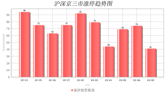今日沪深京三市一共41支股票涨停,较上一个交易的74支减少33支。
