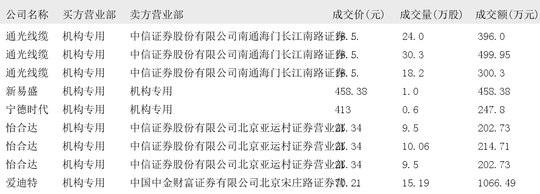 今日大宗交易榜单中出现机构买入席位的个股为:通光线缆、新易盛、宁德时代、怡合达、爱迪特、雅戈尔、创新新材、深圳燃气、新通联、诚邦股份、三棵树、上海谊众、卓越新能、康众医疗。