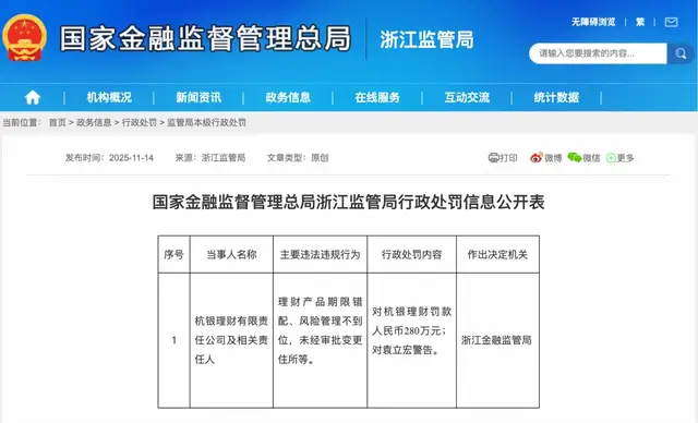 2025 年 11 月,杭州银行旗下杭银理财收到 280 万元罚单,涉及理财产品期限错配、投资决策风控不力、信息披露不充分等多项违规,这是其成立以来最大单笔罚款,3 年累计罚款已达 385 万元。