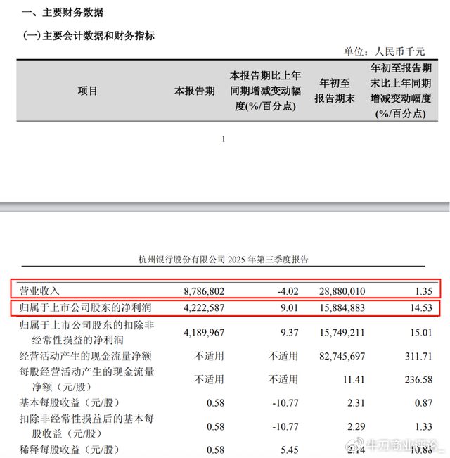 三季度财报数据,揭开了杭州银行的业绩隐忧。前三季度实现营收 288.80 亿元,同比仅增 1.35%,其中第三季度单季营收 87.87 亿元,同比下滑 4.02%,创下上市以来首次单季营收负增长。