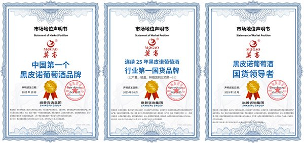 2025年10月,尚普咨询集团正式对甘肃莫高实业发展股份有限公司旗下“莫高”品牌黑皮诺葡萄酒发布市场地位声明,授予其以下三项权威声明:中国第一个黑皮诺葡萄酒品牌、连续25年黑皮诺葡萄酒行业第一国货品牌(依据产量、销量、种植面积综合评定)、黑皮诺葡萄酒国货领导者。