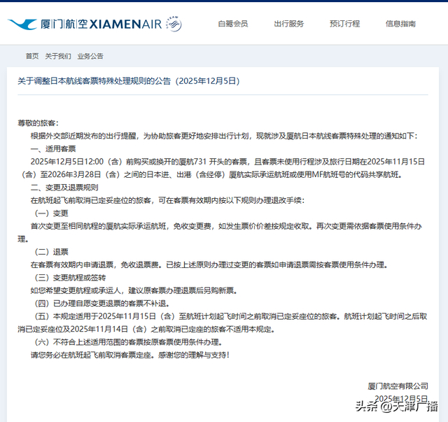 根据外交部近期发布的出行提醒,为协助旅客更好地安排出行计划,现就涉及厦航日本航线客票特殊处理的通知如下: