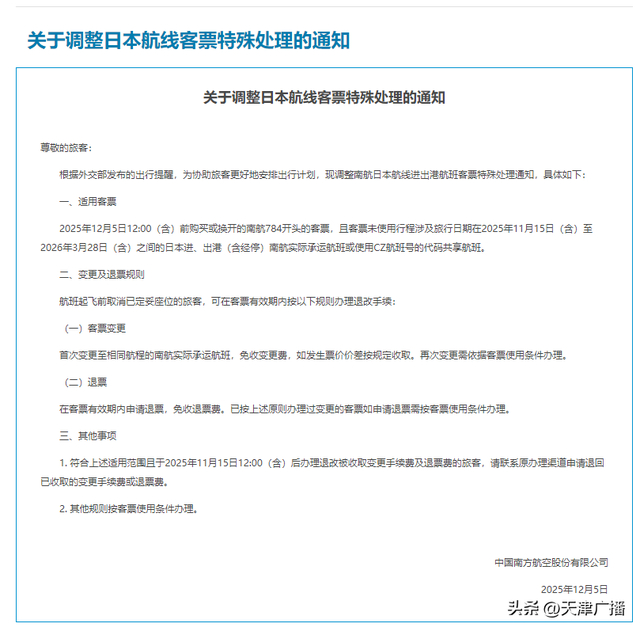 根据外交部发布的出行提醒,为协助旅客更好地安排出行计划,现调整南航日本航线进出港航班客票特殊处理通知,具体如下: