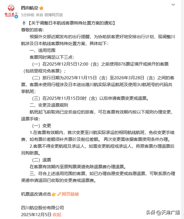 根据外交部近期发布的出行提醒,为协助旅客更好地安排出行计划,现调整川航涉及日本航线客票特殊处置方案,具体如下: