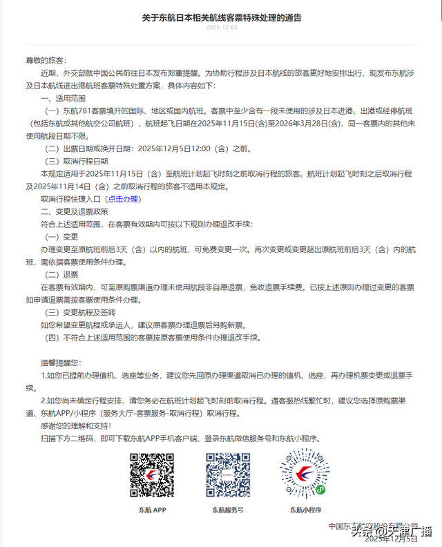 近期,外交部就中国公民前往日本发布郑重提醒。为协助行程涉及日本航线的旅客更好地安排出行,现发布东航涉及日本航线进出港航班客票特殊处置方案,具体内容如下: