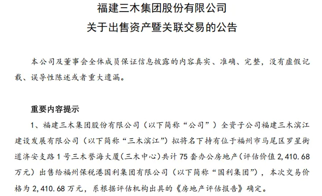 公告显示,三木集团全资子公司福建三木滨江建设发展有限公司(下称三木滨江),拟将名下的办公房产出售给福州保税港国利集团有限公司(下称国利集团)。本次交易的房产位于福州市马尾区罗星街道济安支路1号三木誉海大厦(三木中心),共计75套,建筑面积合计达3765.17平方米。