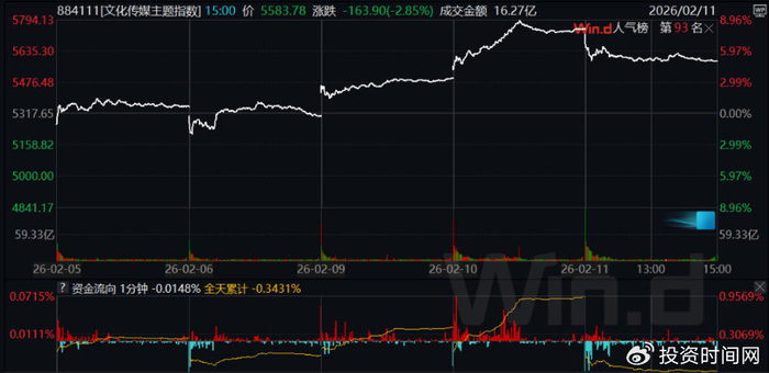 经过两天的讨论热潮,2月11日,资本市场相关概念股走势逐渐出现分化。掌阅科技、欢瑞世纪实现3连板,博纳影业涨超7%。但AI语料库、影视、AI短剧板块集体重挫,文化传媒主题指数(884111.WI)下跌2.85%,横店影视(603103.SH)、金逸影视(002905.SZ)跌停,万达电影(002739.SZ)、幸福蓝海(300528.SZ)跌幅超10%,中文在线、奥飞娱乐(002292.SZ)、读者传媒(603999.SH)、视觉中国(000681.SZ)等跌幅均在4%以上。