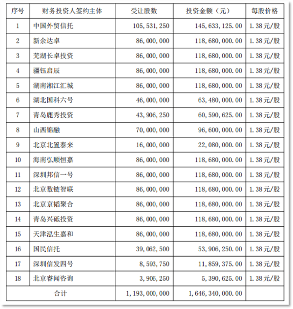 99家意向投资人角逐,最终18家机构财务投资人和2家产业投资人脱颖而出,以16.46亿元和6.1亿元的价格“分食”11.93亿股和5亿股。