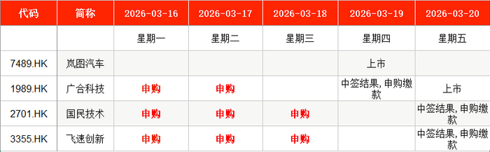 其中,广合科技(01989.HK)在周一至周二申购;国民技术(02701.HK)、飞速创新(03355.HK)等,均在本周一至周三申购。