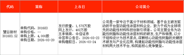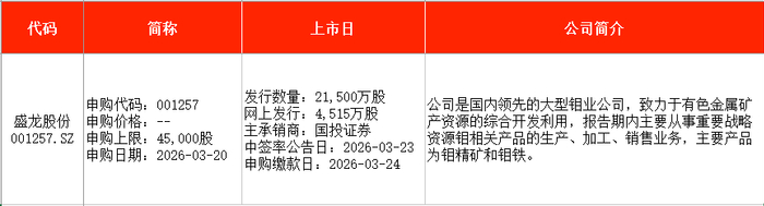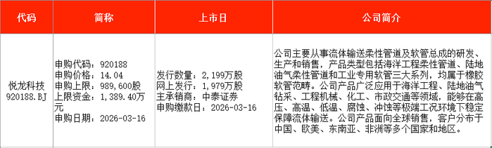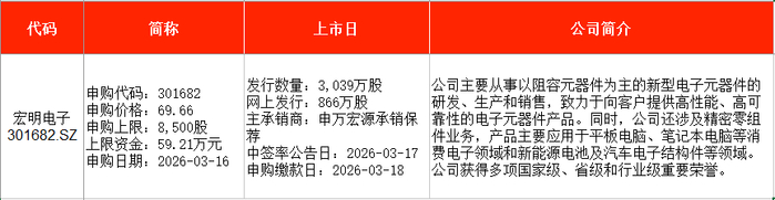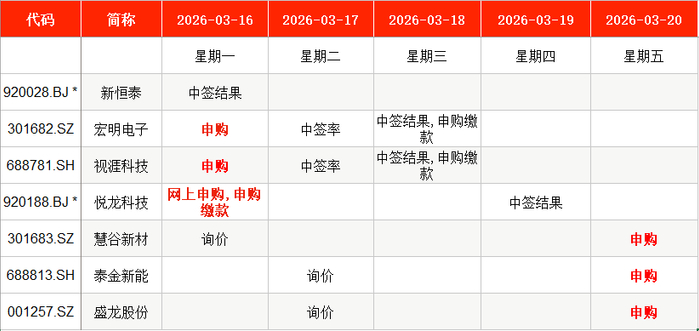 从时间表看,宏明电子(301682)、视涯科技(688781)、悦龙科技(920188)等在本周一(3月16日)申购;慧谷新材(301683)、泰金新能(688813)、盛龙股份(001257)等在本周五申购。