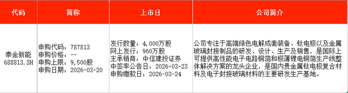 Wind资料显示,泰金新能专注于高端绿色电解成套装备、钛电极以及金属玻璃封接制品的研发、设计、生产及销售,是国际上可提供高性能电子电路铜箔和极薄锂电铜箔生产线整体解决方案的龙头企业,是国内贵金属钛电极复合材料及电子封接玻璃材料的主要研发生产基地。