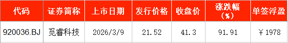 3月9日,觅睿科技(920036)在北交所挂牌上市,发行价为21.52元/股,截至上市首日收盘,该股报41.3元/股,涨幅为91.91%。以收盘价计算,投资者中一签浮盈为1978元。