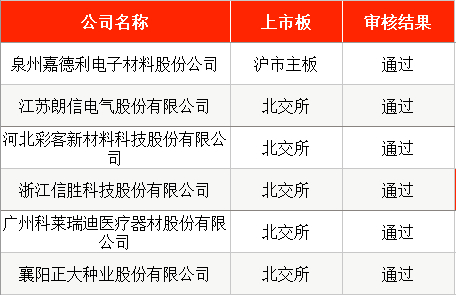 其中,拟在上证主板IPO的泉州嘉德利电子材料股份公司(下称“嘉德利”),以及拟在北交所IPO的江苏朗信电气股份有限公司(下称“朗信电气”)、河北彩客新材料科技股份有限公司(下称“彩客科技”)、浙江信胜科技股份有限公司(下称“信胜科技”)、广州科莱瑞迪医疗器材股份有限公司(下称“科莱瑞迪”)、襄阳正大种业股份有限公司(下称“正大种业”)等,均成功过会。