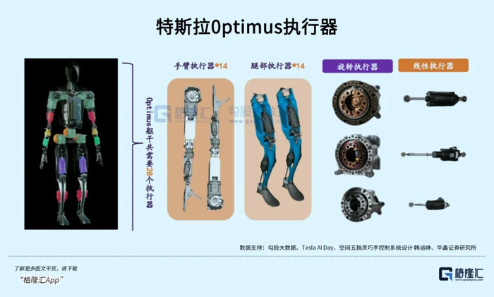 机器人关节数量多,每个关节需配备至少一个执行器。根据公开信息,特斯拉Optimus有28个身体关节执行器,灵巧手还需额外的微型执行器。预计量产物料成本中运动系统(包含线性执行器+旋转执行器+灵巧手)成本最高,约占70%以上。
