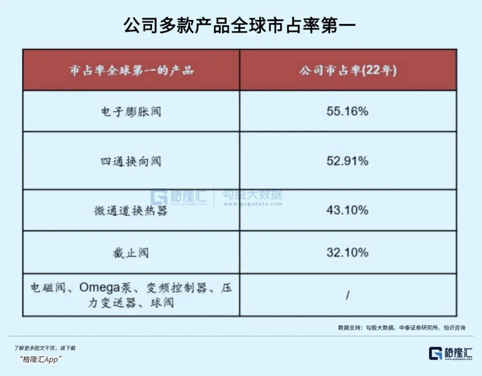 根据招股书,三花是全球最大的制冷空调控制元器件制造商,市场占有率约为45.5%;在全球汽车热管理系统零部件市场的市场占有率约为4.1%,全球排名第五。