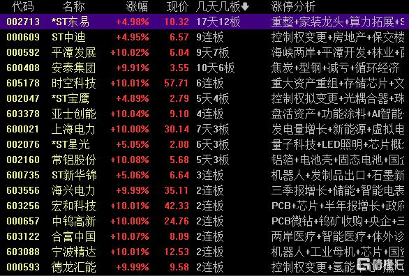 焦点股方面,福建本地股平潭发展9天7板,并购重组的时空科技6连板,煤炭股安泰集团10天6板,机器人概念股亚士创能4连板。