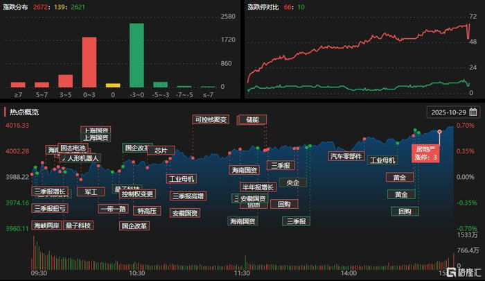 10月29日,沪指站稳4000点,北证50指数涨8.41%,全市场近2700股上涨。市场热点聚焦光伏设备、海南板块,有色金属板块活跃,另外,银行股普跌,盲盒经济、商业百货板块普跌。
