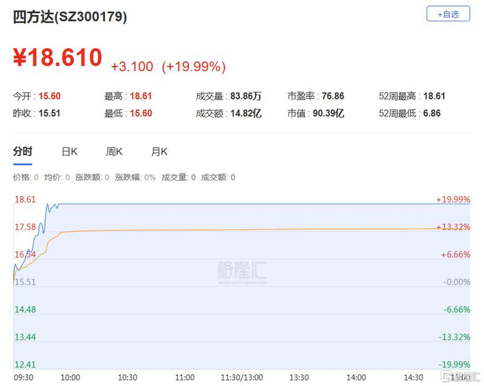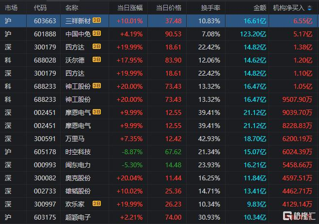 龙虎榜中涉及机构专用席位的个股中,当日净买入额前三为四方达、摩恩电气、万里马,分别为1.1亿元、8228.83万元、6200.19元。