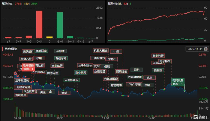 11月11日,A股三大指数集体调整,沪指跌0.39%报4002点,深证成指跌1.03%,创业板指跌1.4%。全市场逾2500股下跌。市场热点聚焦培育钻石、光伏设备板块爆发、大消费板块,另外,存储芯片、汽车芯片板块下挫。
