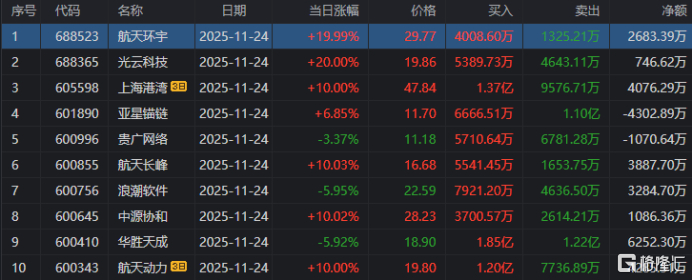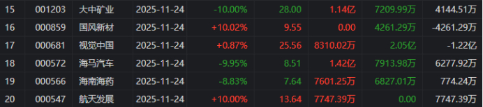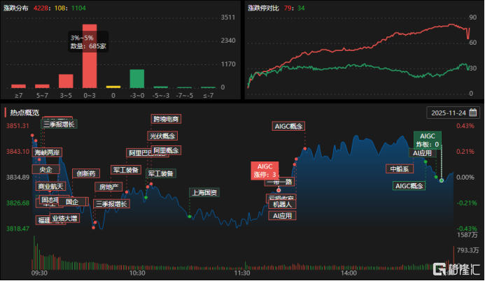 11月24日,沪深两市成交额1.73万亿,较上一个交易日缩量2379亿。板块方面,商业航天、军工、AI应用等板块涨幅居前,而锂矿、海南、磷化工等板块下挫。