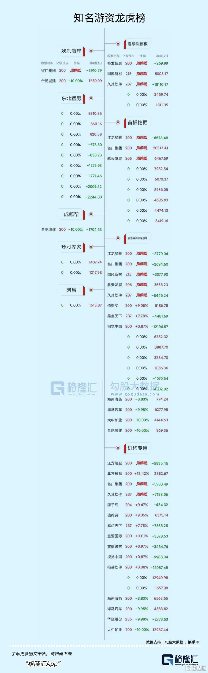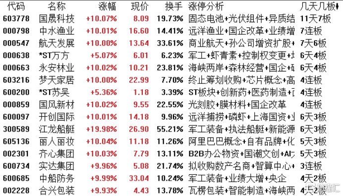 高位股方面,国晟科技11天7板,中水渔业7连板,航天发展7天6板,*ST万方、永安林业6天4板,梦天家居、*ST苏吴、国风新材4连板,开创国际、江龙船艇6天3板。