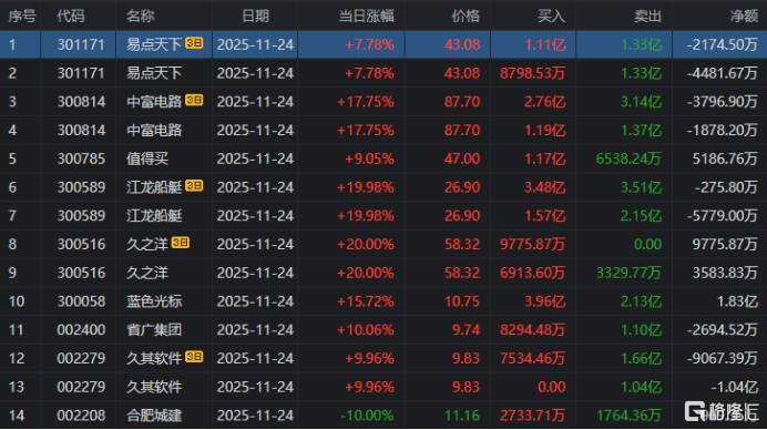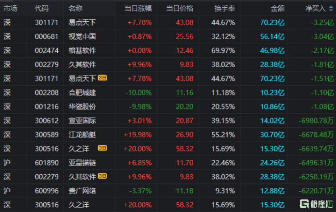 龙虎榜单日净卖出额前三为易点天下、视觉中国、榕基软件,分别为3.25亿、3.04亿元、2.17亿元。