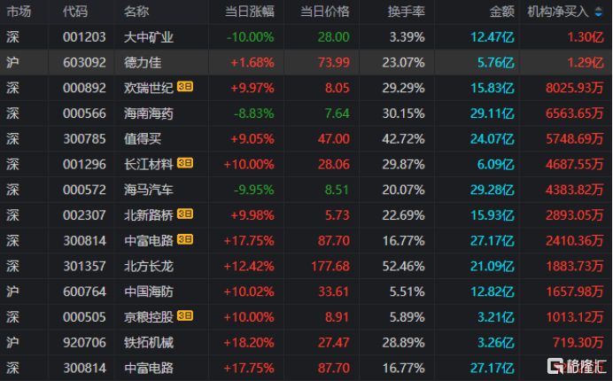 龙虎榜中涉及机构专用席位的个股中,当日净买入额前三为大中矿业、德力佳、海南海药,分别为1.3亿元、1.29亿元、6563.65万元。