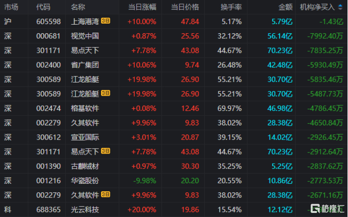 龙虎榜中涉及机构专用席位的个股中,当日净卖出额前三为视觉中国、易点天下、省广集团,分别为7992.4万元、7835.25万元、5930.49万元。