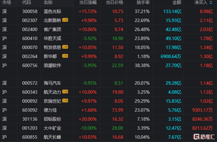 龙虎榜单日净买入额前三为蓝色光标、省广集团、华胜天成,分别为8.98亿元、2.03亿元、1.78亿元。