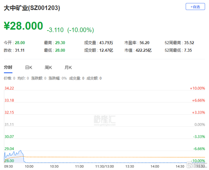 大中矿业:今日跌停,全天换手率3.39%,成交额12.47亿元。机构净买入1.3亿元。