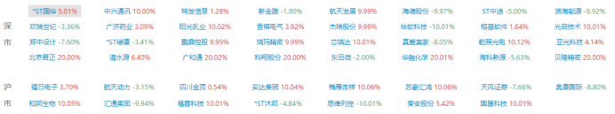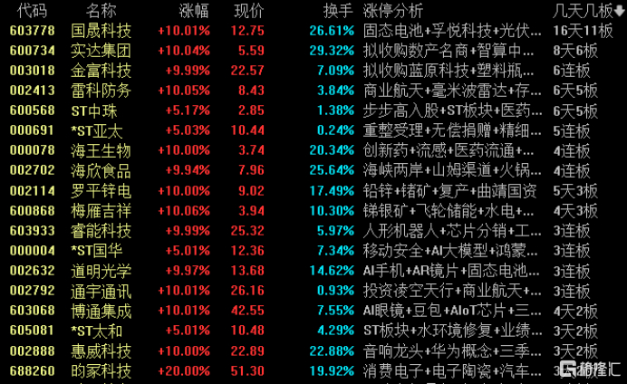 高位股方面,名辰科技16天11板,实达集团8天6板,金富科技6连板,雷科防务、ST中珠6天5板,ST亚太5连板,海王生物、海欣食品4天4板,罗平锌电5天3板,梅雁吉祥4天3板,睿能科技、*ST国华、道明光学、通宇通讯3连板。