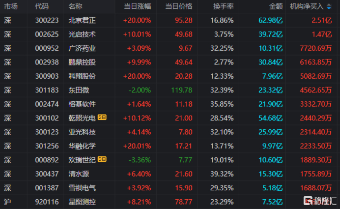 龙虎榜中涉及机构专用席位的个股中,单日净买入额前三为北京君正、光启技术、广济药业,分别为2.51亿、1.47亿、7720.69万。