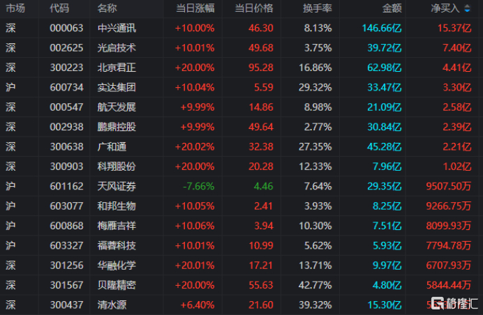 龙虎榜单日净买入额前三为中兴通讯、光启技术、北京君正,分别为15.37亿、7.40亿、4.41亿。