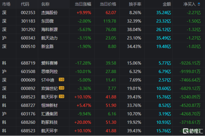 龙虎榜单日净卖出额前三为杰瑞股份、东田微、海科新源,分别为2.27亿、1.50亿、1.32亿。