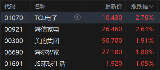 格隆汇12月2日|港股家电股普遍上涨,其中,TCL电子、海信家电涨近3%,美的集团涨2%刷新阶段新高,海尔智家涨1.8%,JS环球生活涨超1%。