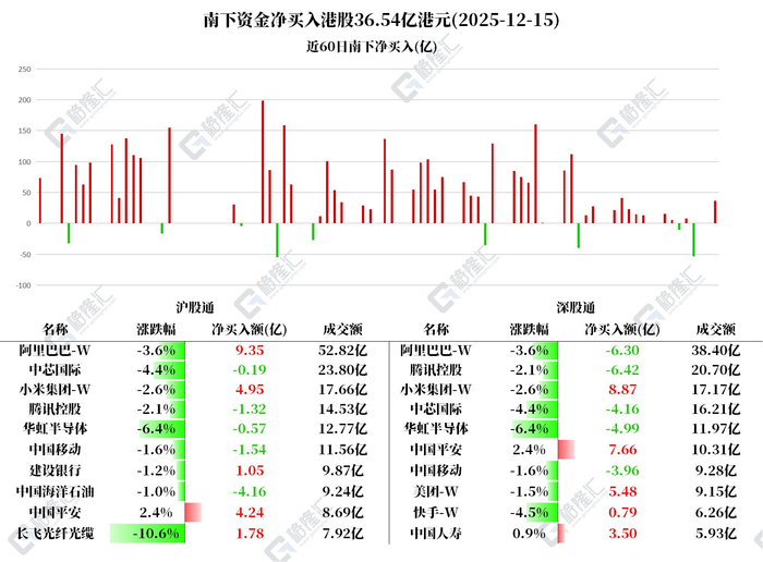 格隆汇12月15日|南下资金今日净买入港股36.54亿港元。其中:
