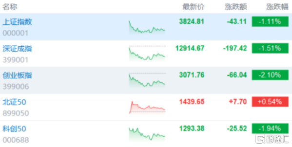 12月16日,A股三大指数集体下挫,截至收盘,沪指跌1.11%报3824点,深证成指跌1.51%,创业板指跌2.1%,北证50指数逆市涨0.54%。全市场成交额1.75万亿元,较前一交易日缩量463亿元,超4300股下跌。