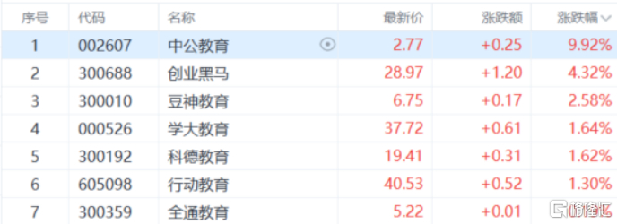 教育板块走强,中公教育涨停,创业黑马涨超4%,豆神教育涨超2%,学大教育、科德教育、行动教育等多股跟涨。