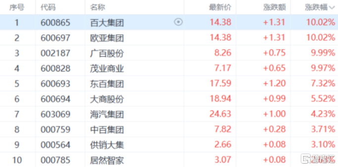 免税概念板块上涨,百大集团、欧亚集团、广百股份涨停,东百集团涨超7%,大商股份、海汽集团、中百集团等多股跟涨。