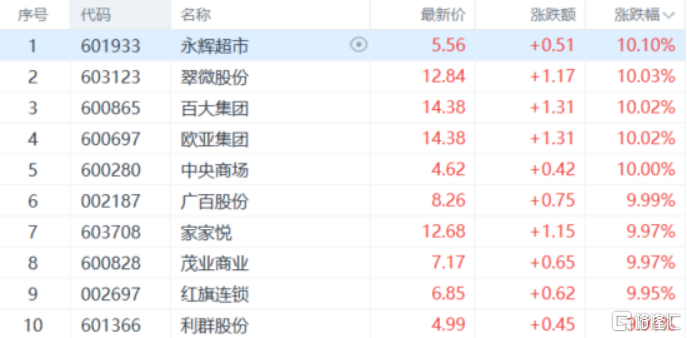 零售板块拉升,永辉超市、翠微股份、百大集团、欧亚集团等多股涨停,东百集团、三江购物、大商股份等多股跟涨。