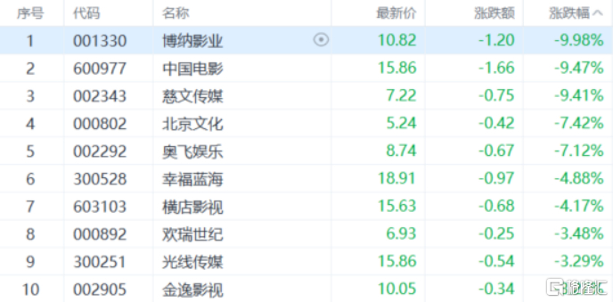 影视院线板块下挫,博纳影业跌停,中国电影、慈文传媒跌超9%,北京文化、奥飞娱乐、幸福蓝海、横店影视等多股跟跌。